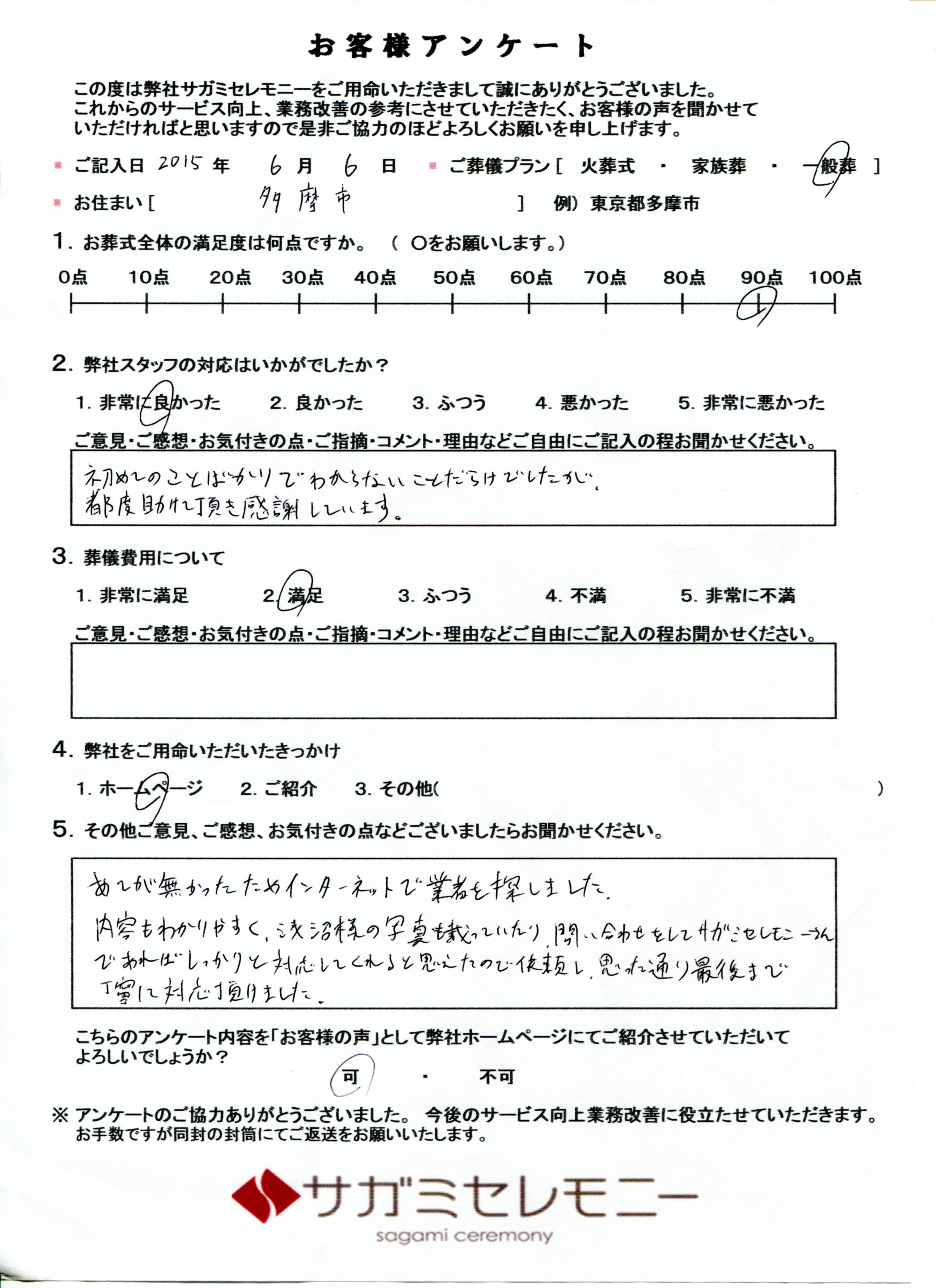 あてが無かったためインターネットで業者を探しました。内容もわかりやすく、浅沼様の写真も載っていたり、問い合わせをしてサガミセレモニーさんであればしっかりと対応してくれると思えたので依頼し、思った通り最後まで丁寧に対応頂けました。