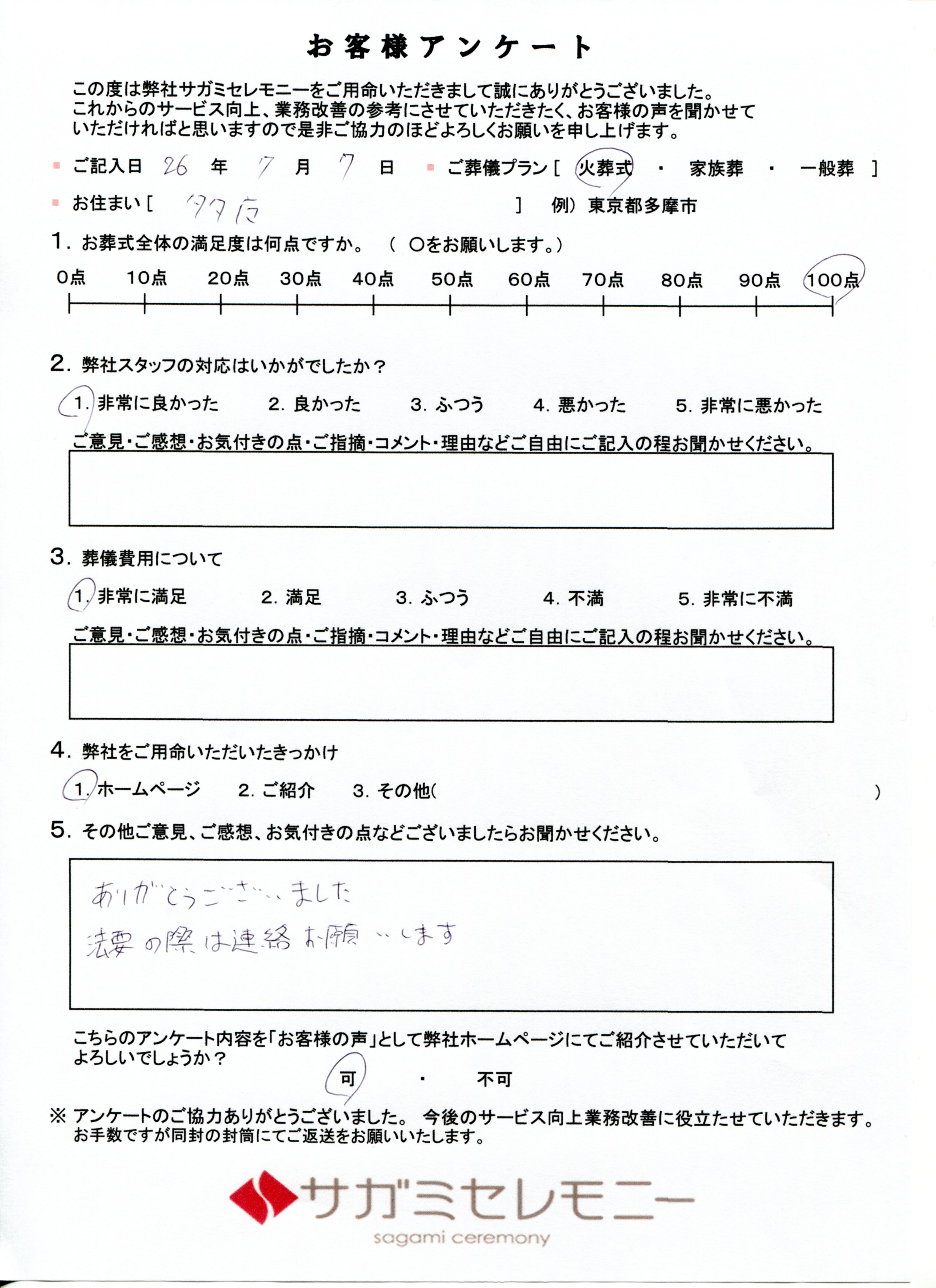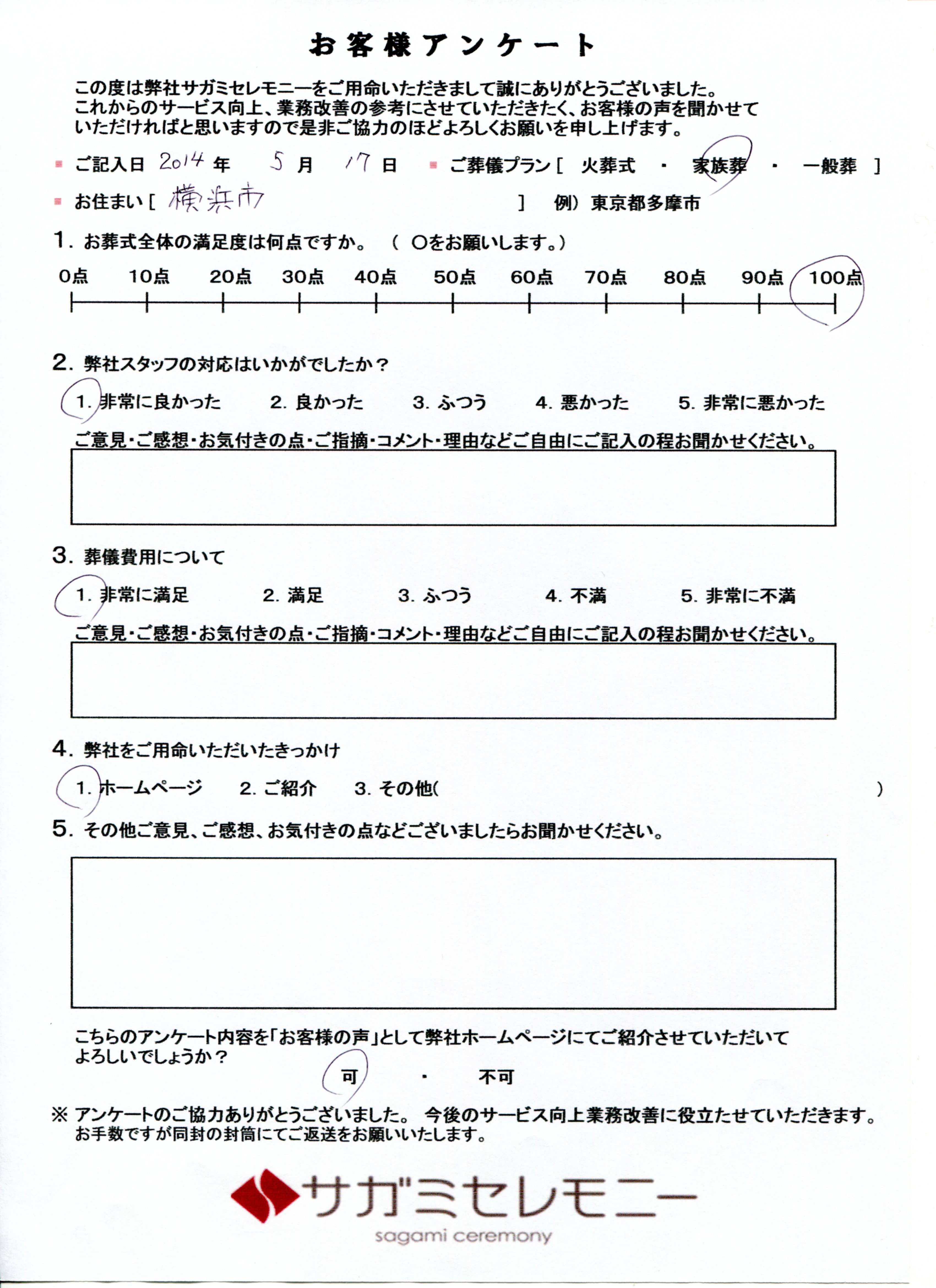 病院にお迎えにきていただくところから七七回忌までお世話になりました。費用の点、スタッフのみなさんの対応の点など全般的にたいへん信頼できる葬儀屋にお会いできてとてもありがたいと思っております。手続き関係の書類もとても役に立ちました。今後も何かありましたらぜひご相談させていただきたいと思っております。